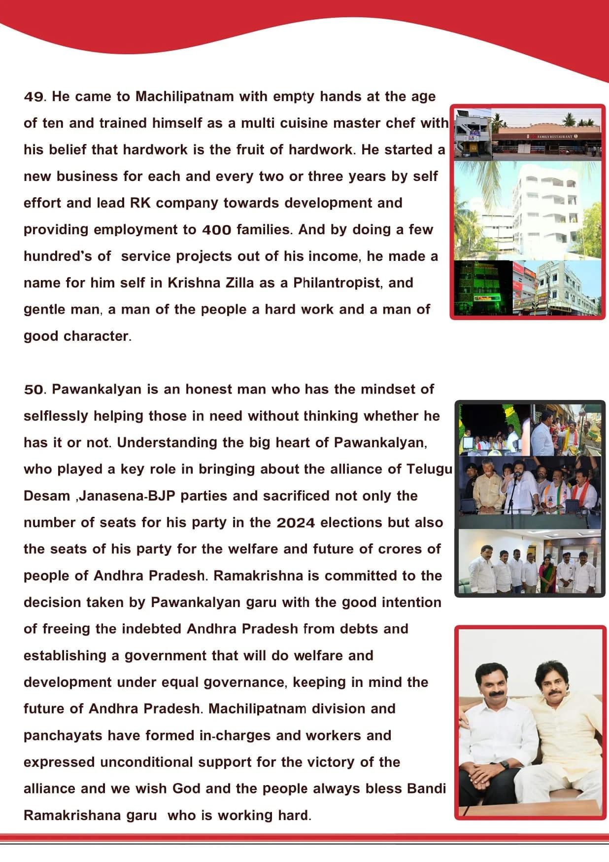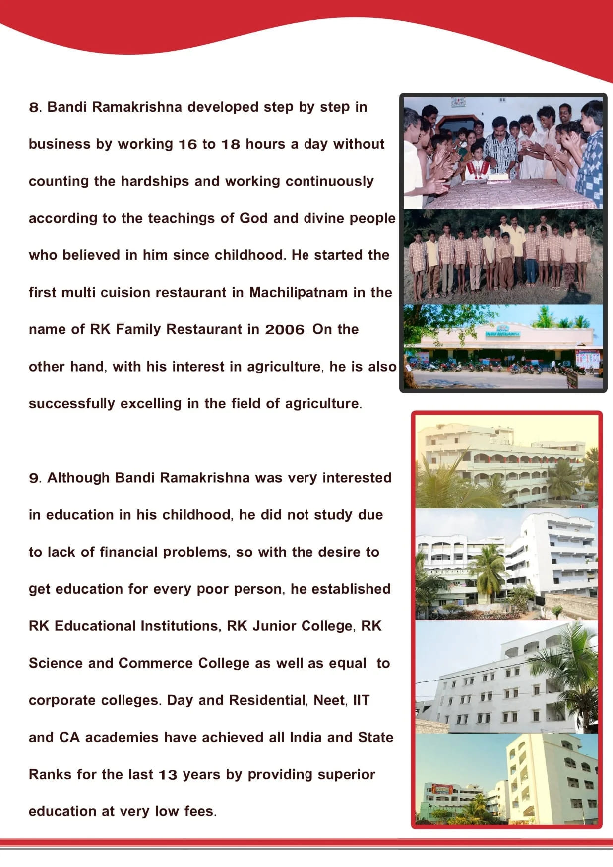 Bandi Rama Krishna, popularly known as RK, was born in 1964 to Bandi Venkateswara Rao and Bapanamma in Alapadu, a village bordering Krishna and West Godavari districts. With three elder sisters and an elder brother (Bandi Satyanarayana Garu), RK was the youngest of seven and grew up in a middle-class farming community. He has now been appointed as the Chairman of the Machilipatnam Constituency DCMS, where he is committed to driving development and serving the community.